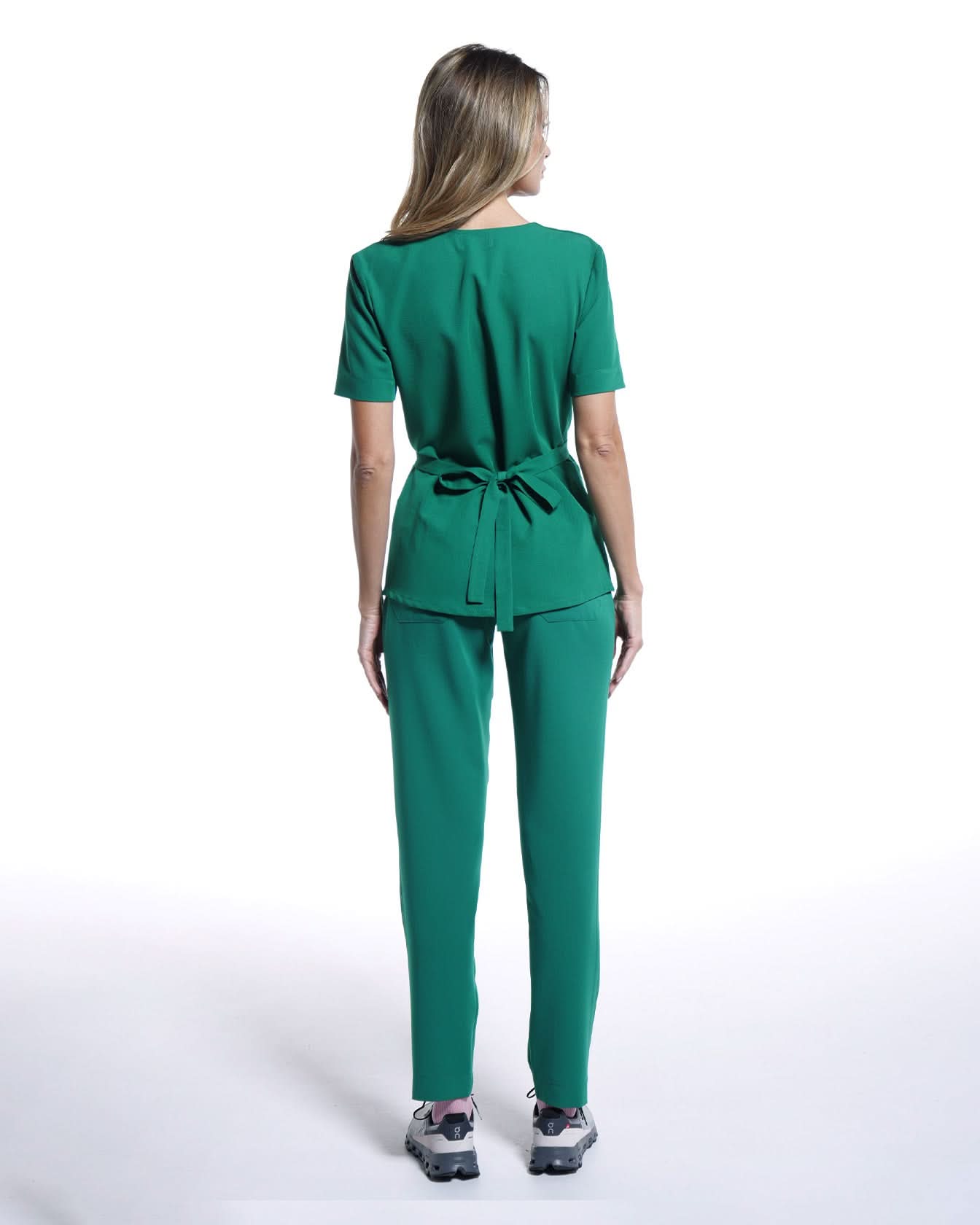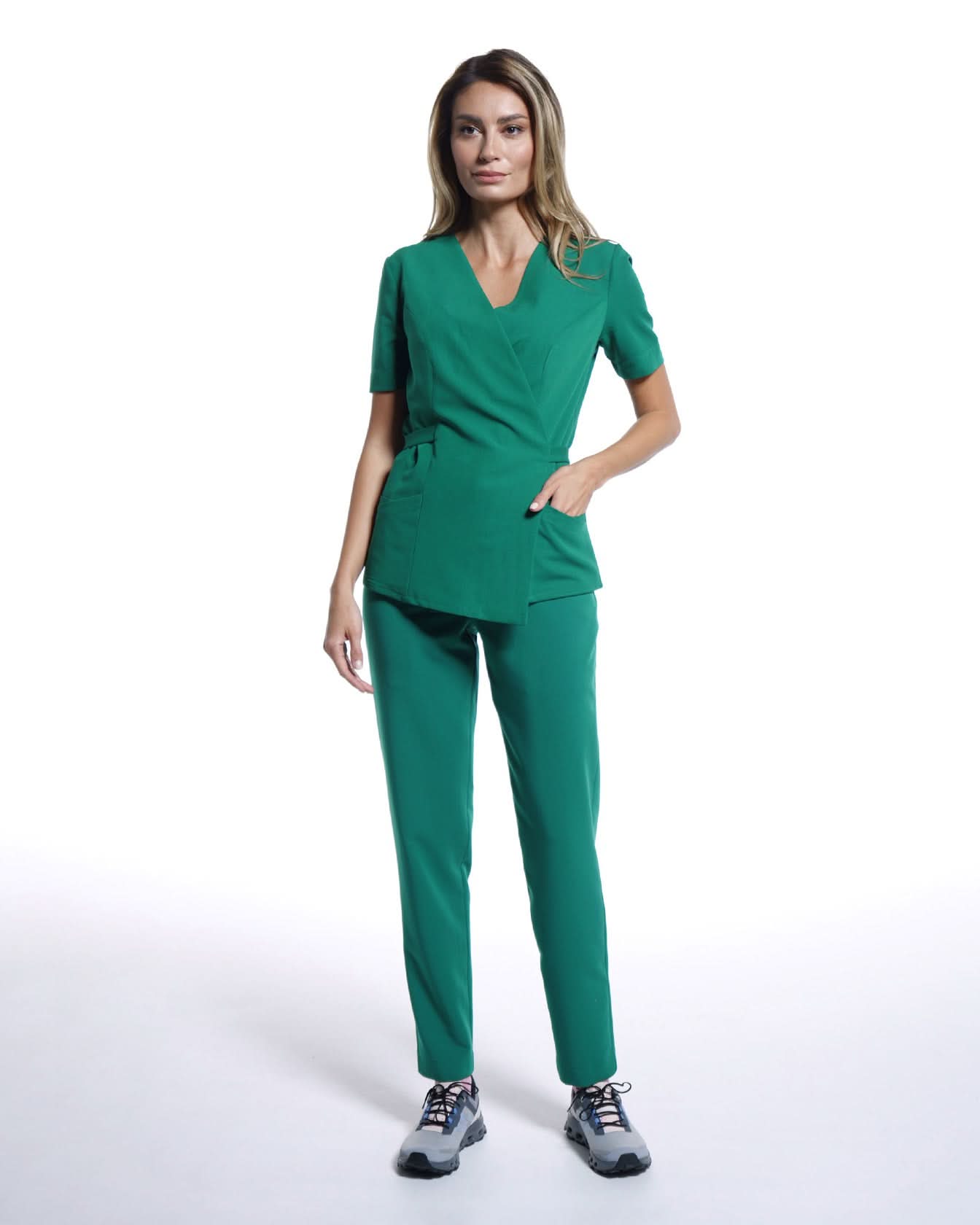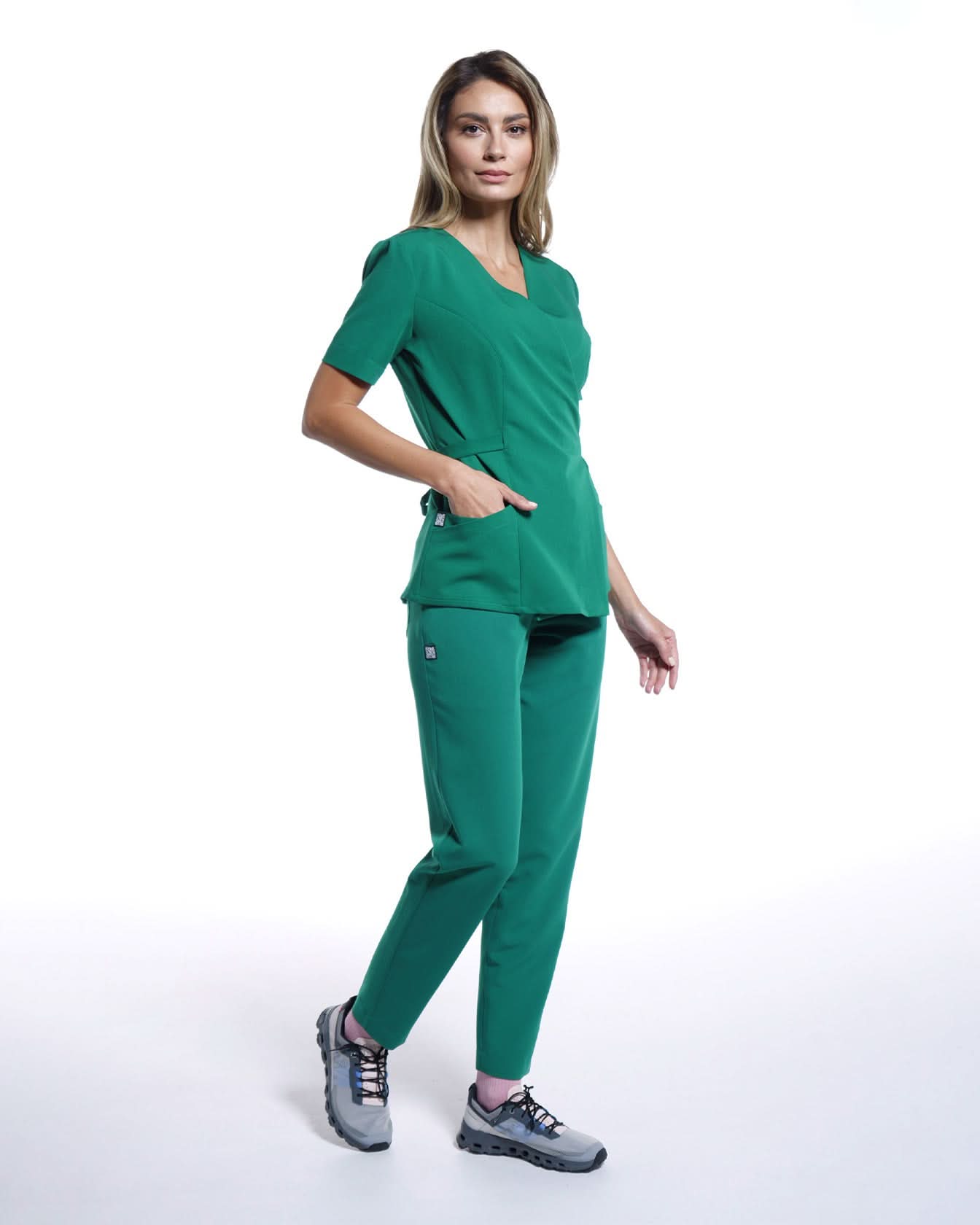 Grünes, tailliertes medizinisches Oberteil SIENA aus elastischem Gewebe mit zwei Seitentaschen. Modell mit verstellbarem Taillenband. Das Material des Oberteils ist weich, atmungsaktiv, stammt aus nachwachsenden Rohstoffen und ist sowohl elastisch als auch knitterarm.