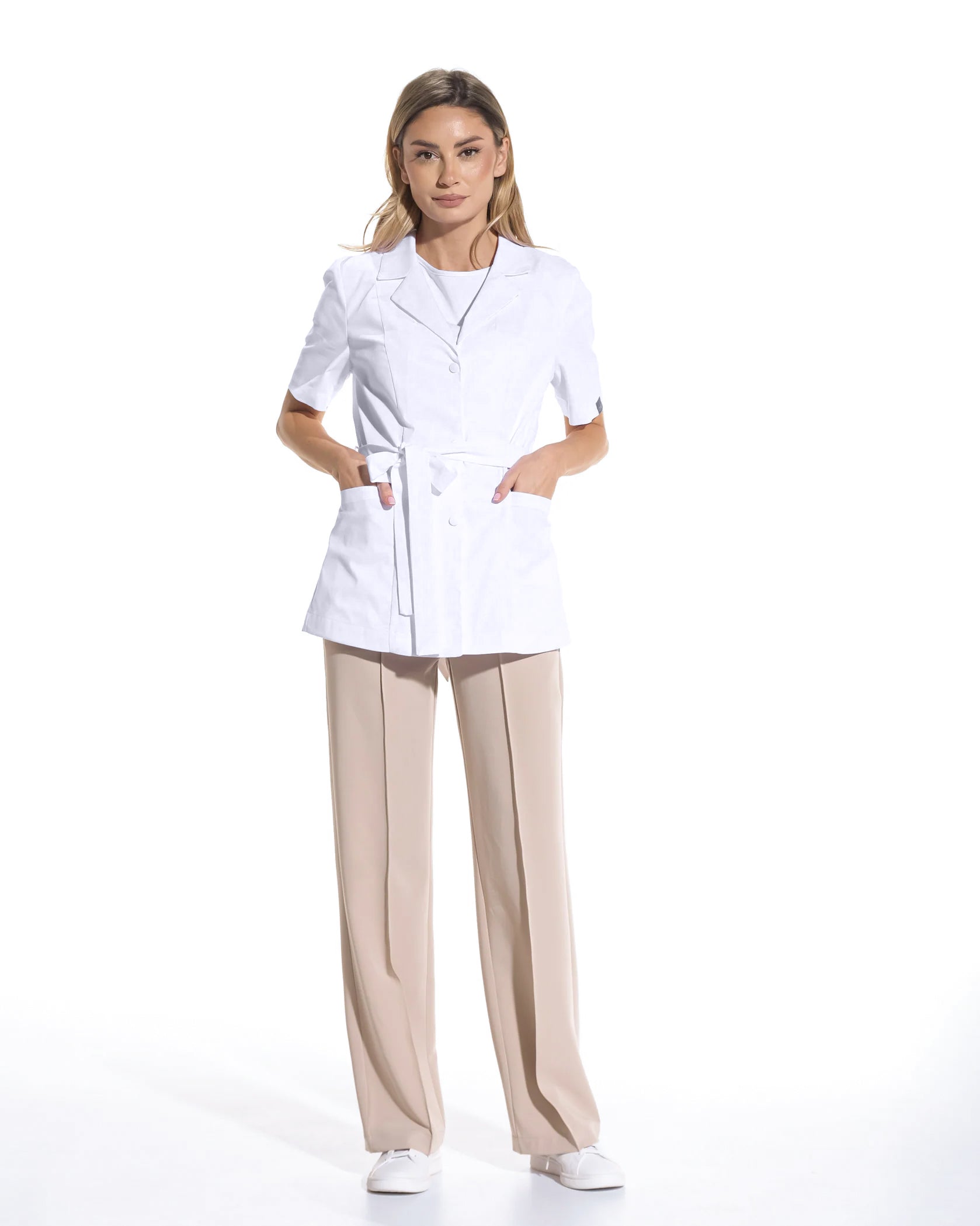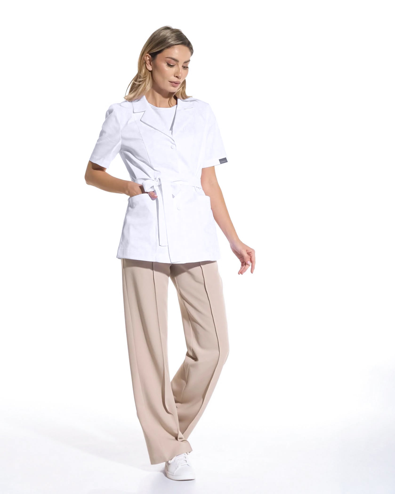 Weißer DIAZ-Arztkittel mit verstellbarem Taillenband. Verschluss mit Druckknöpfen, vier übereinanderliegende Seitentaschen und V-Ausschnitt.