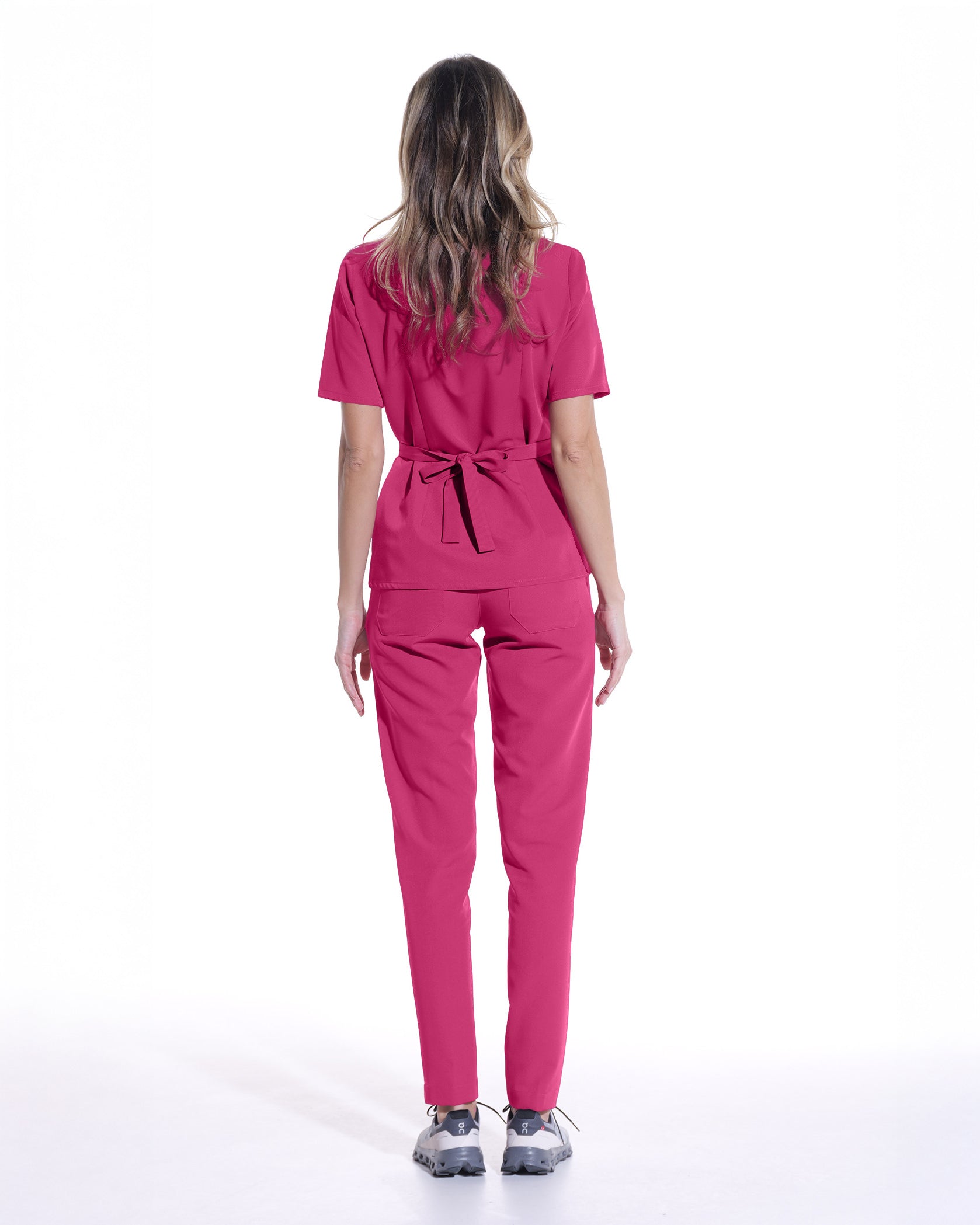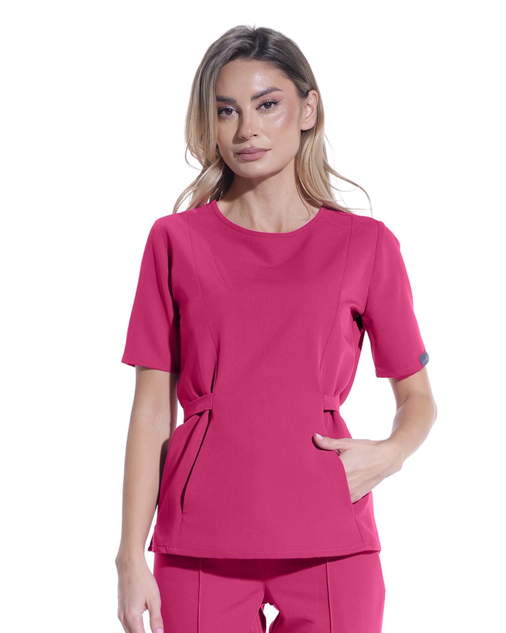 Magenta-farbene medizinische Bluse mit verstellbarem Taillenband und Fronttasche. Das Material, aus dem die Bluse gefertigt ist, ist weich, atmungsaktiv, stammt aus erneuerbaren Rohstoffen und bietet sowohl Elastizität als auch Knitterfestigkeit.