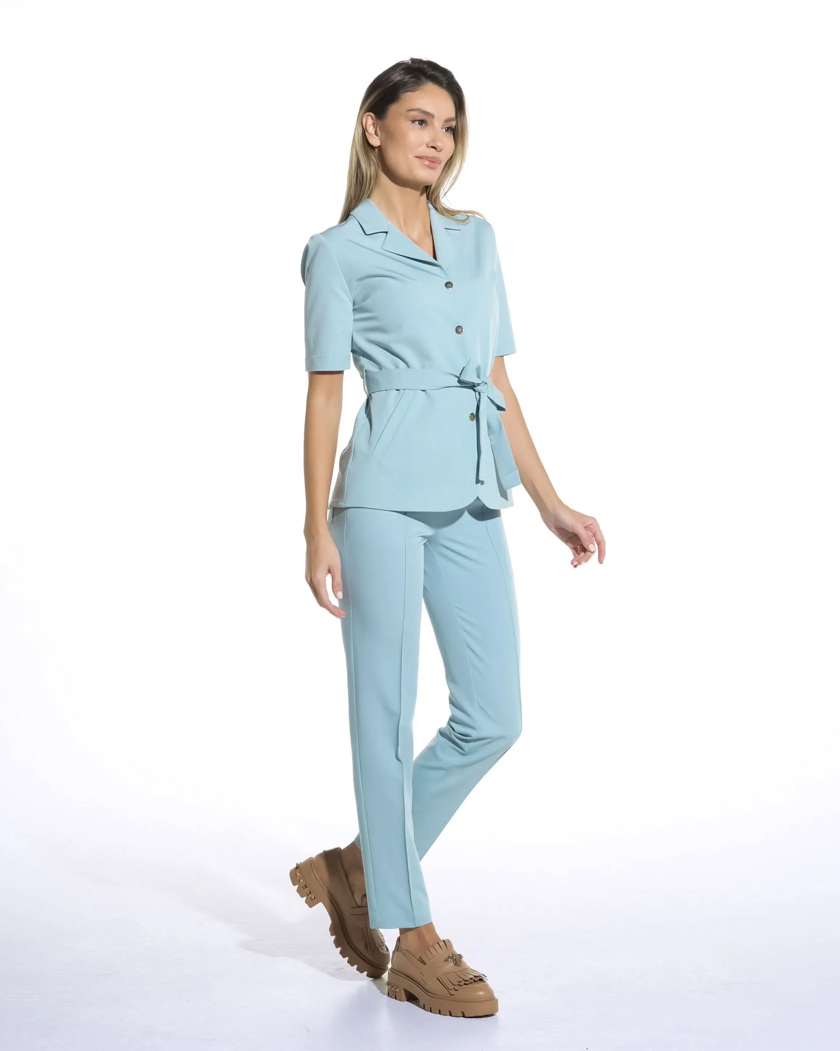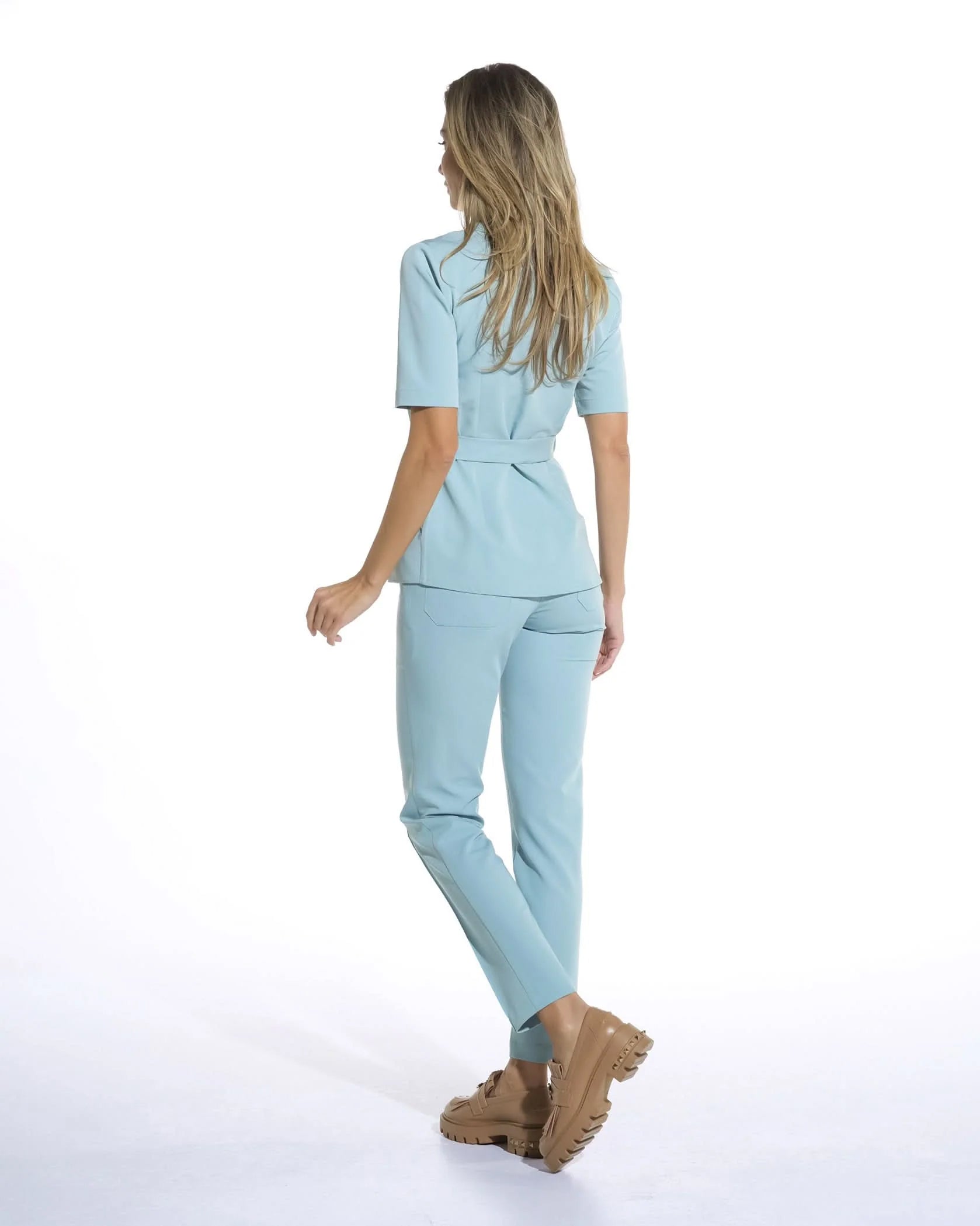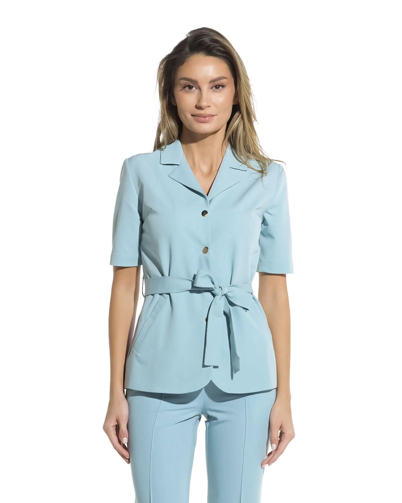 Medizinische Bluse in Blau aus elastischem Gewebe mit zwei Seitentaschen. Verschluss mit goldenen Druckknöpfen und verstellbarer Taillenbund mit Kordel für zusätzliche Eleganz. Das Material der Bluse ist weich, atmungsaktiv, stammt aus nachwachsenden Rohstoffen und ist sowohl elastisch als auch knitterarm.