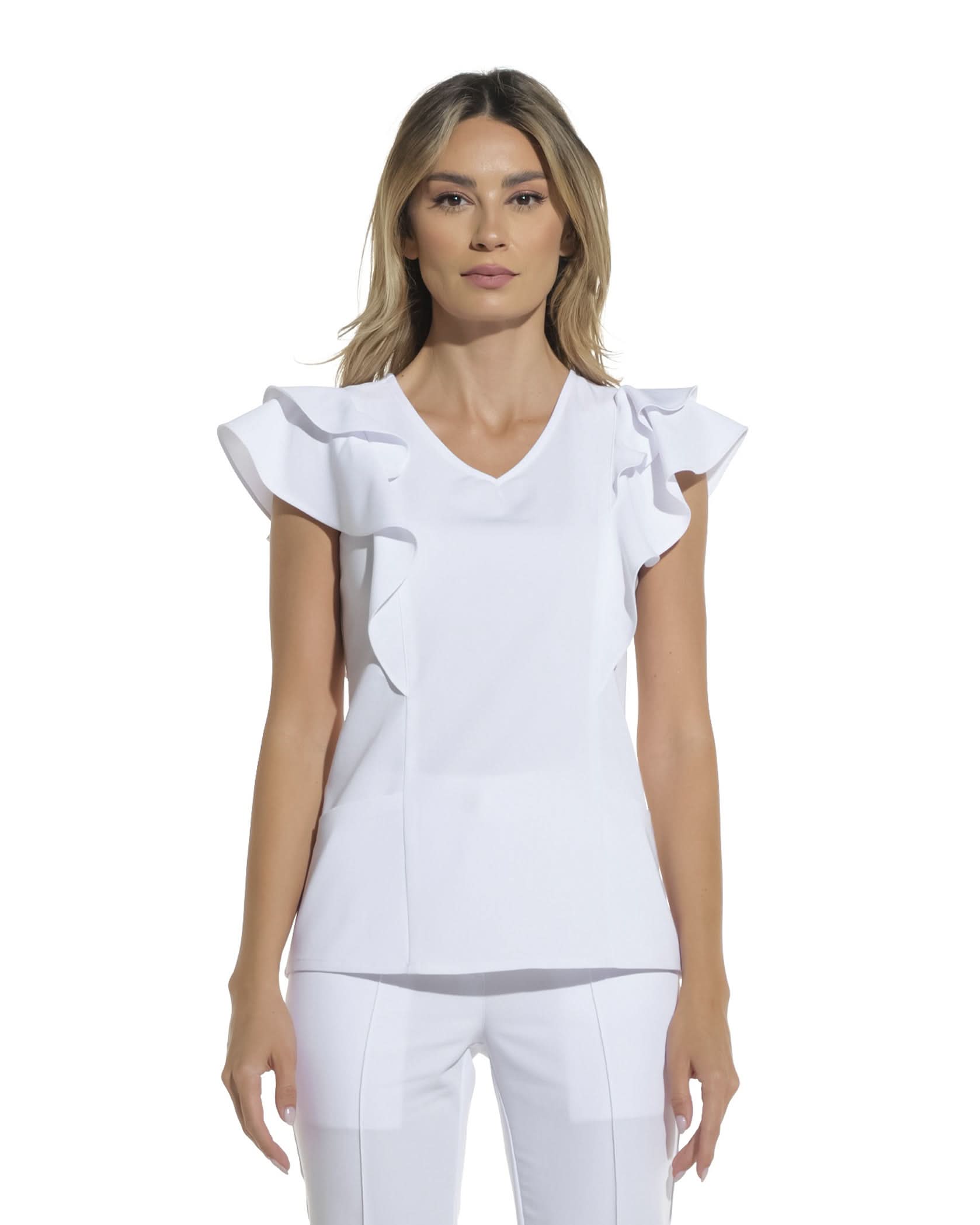Elegant AVRA white medical blouse, made of stretchy fabric, with 2 side pockets. The model features 2 rows of ruffles on the shoulders for added elegance. The material is soft, breathable, made from renewable raw materials, and is both elastic and wrinkle-resistant.