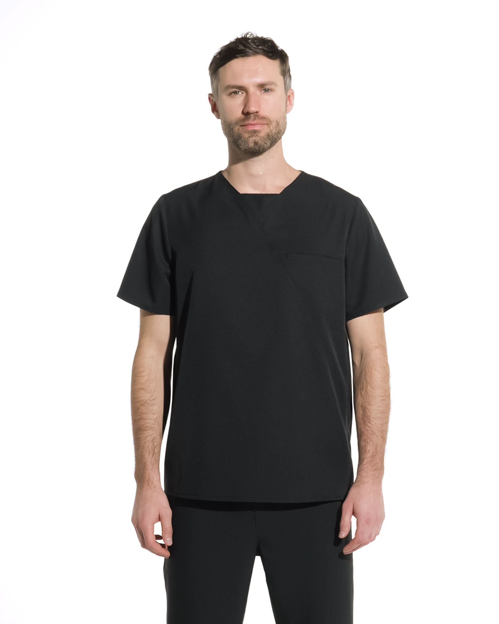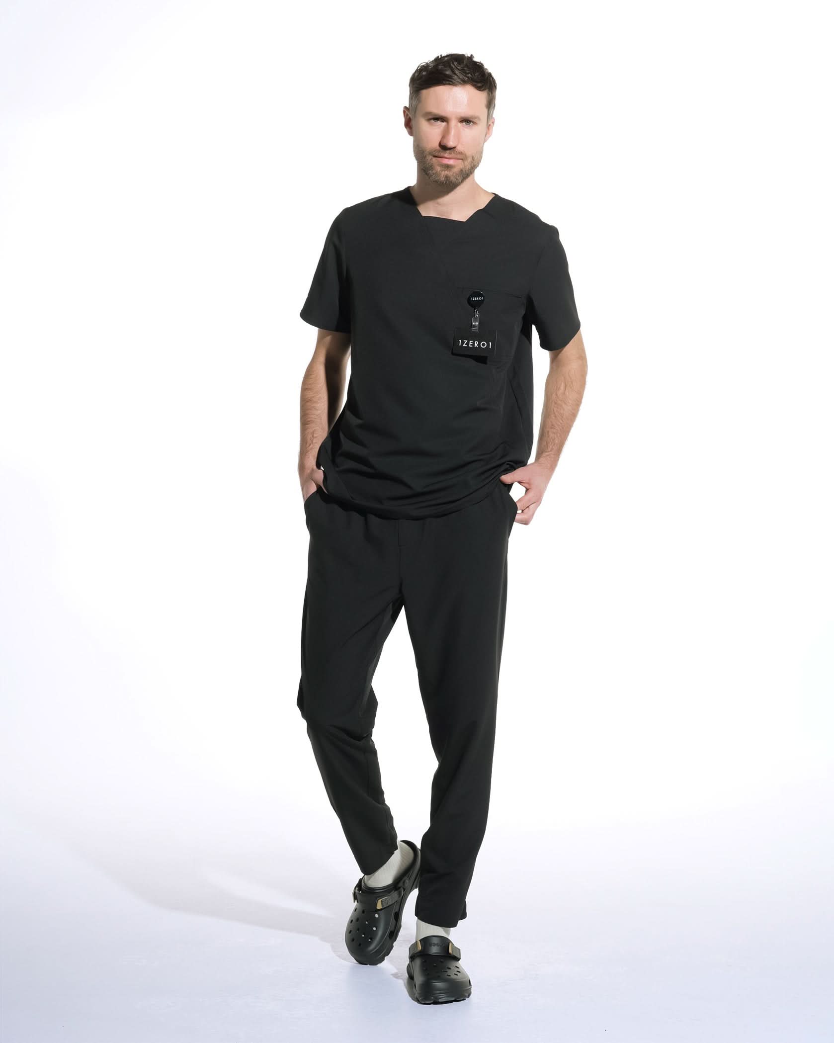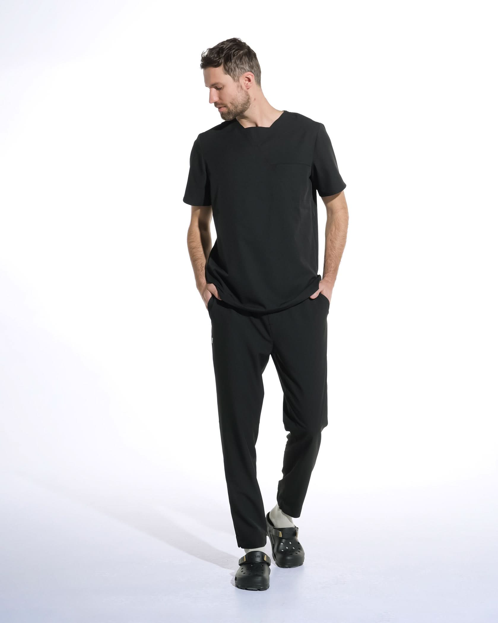 RIZZ black medical trousers with elastic waistband and contrasting adjustable drawstring. The material is soft, offering both elasticity and wrinkle resistance.