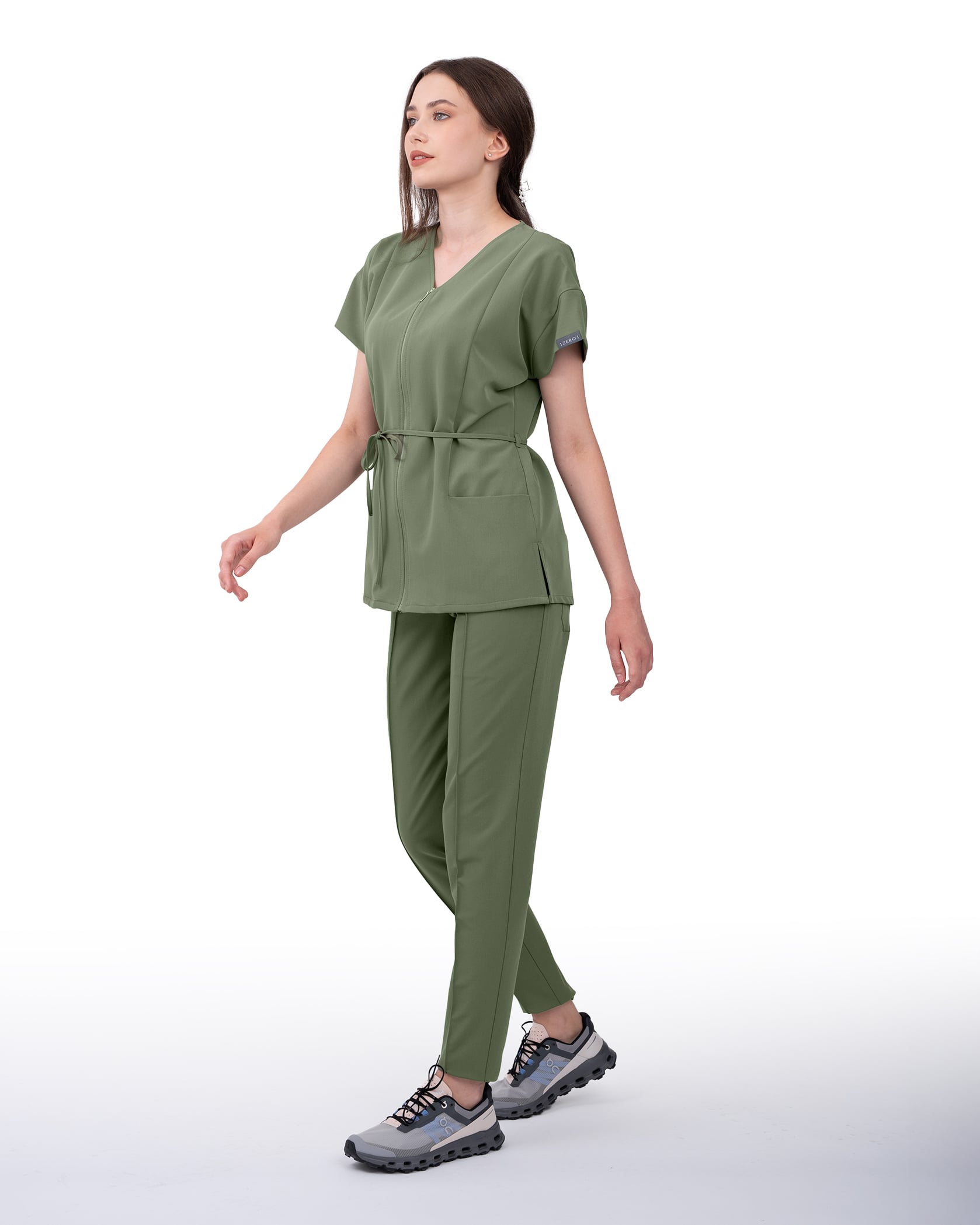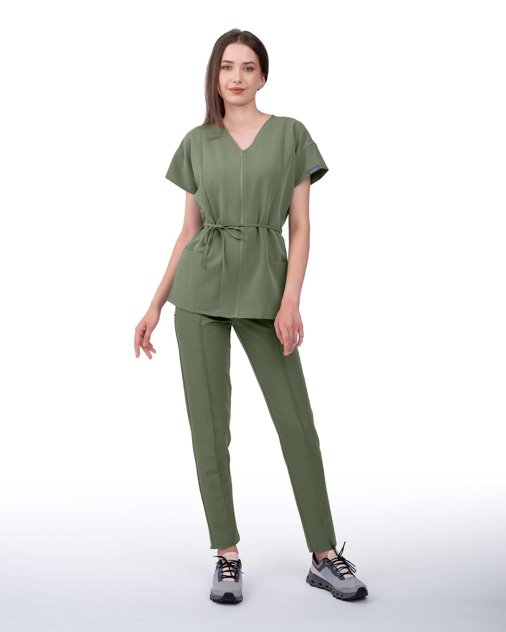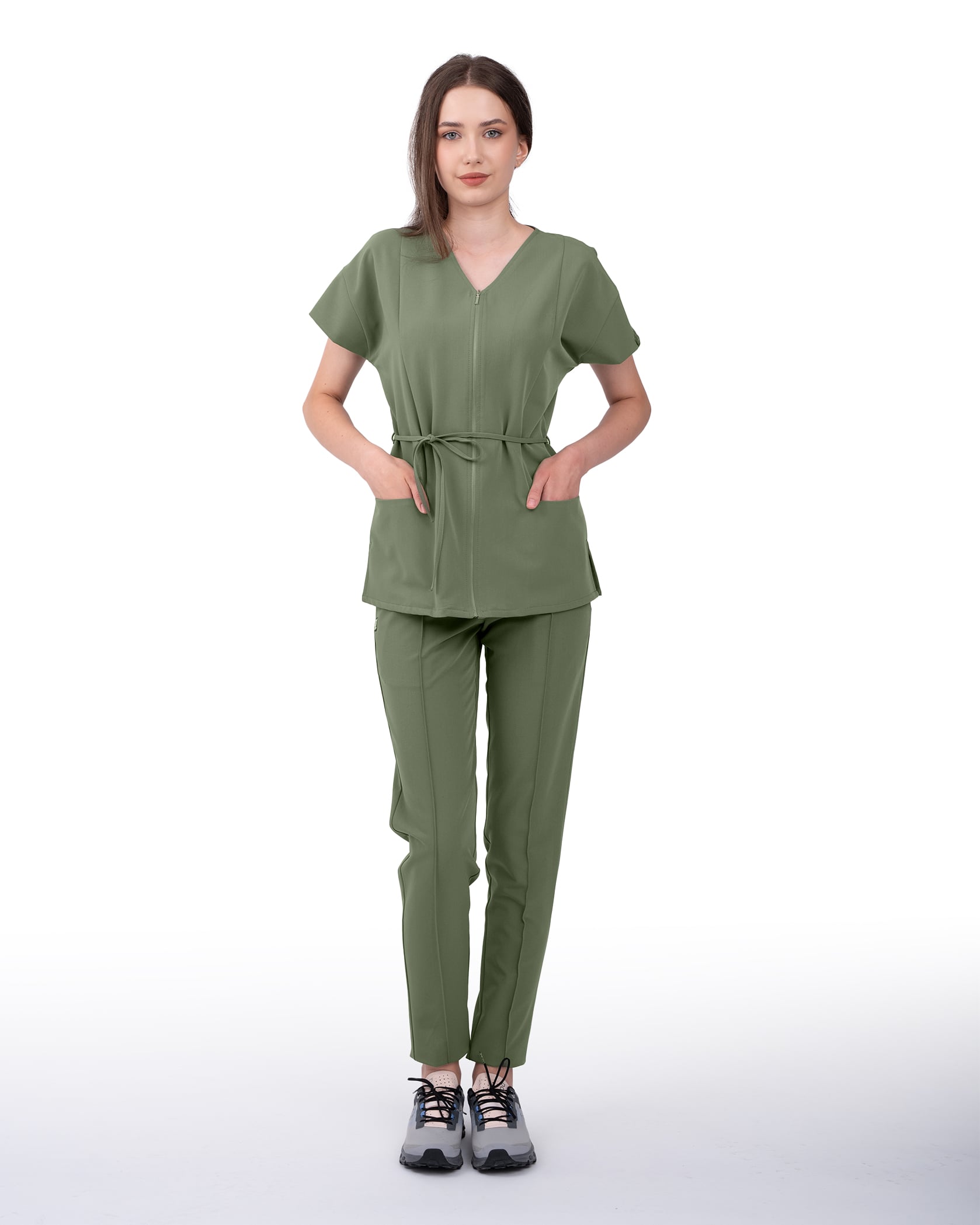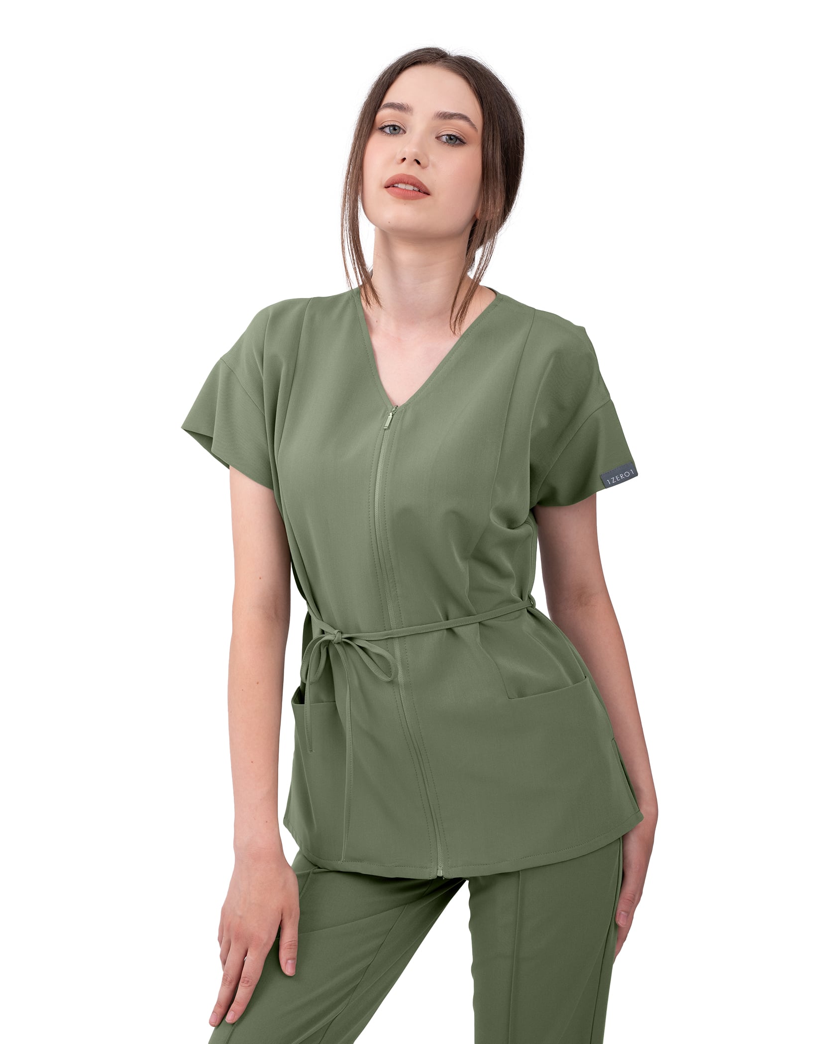 The Rosa medical blouse maintains classic lines but gives them a modern twist that brings a touch of style and individuality to each day at the clinic. Equipped with a discreet front zipper, it offers a clean and professional look, as well as added ease when dressing. The two generous pockets are designed for practicality so you have quick access to everything you need: phone, keys, or stamp. The dropped sleeve adds a stylish air, while the adjustable drawstring at the waist allows you to tailor the blouse according to your figure or preference for a loose or fitted fit—you choose.