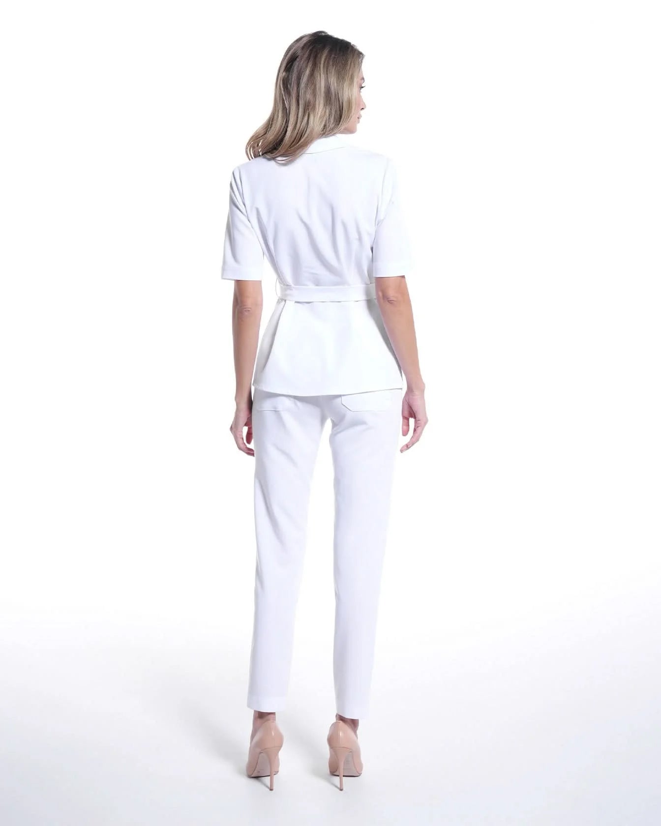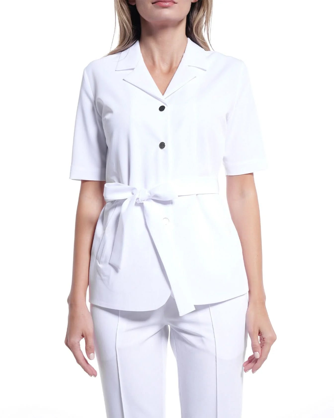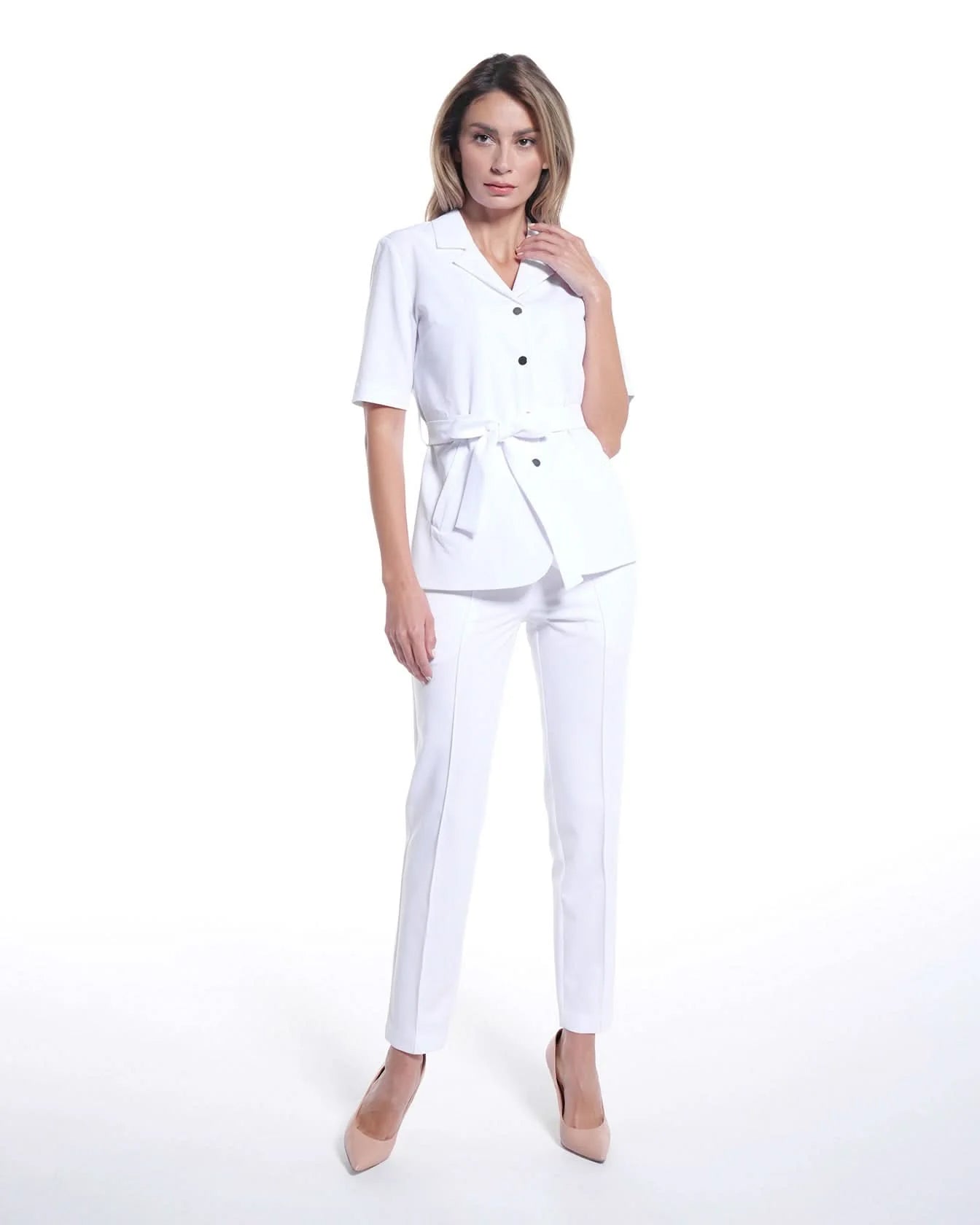 White medical tunic made of stretchy fabric, featuring 2 side pockets. Fastens with gold buttons and has an adjustable waist with a drawstring for added elegance. The material is soft, breathable, made from renewable raw materials, and offers both elasticity and wrinkle resistance.