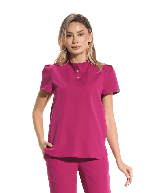 Bluza medicala magenta cu guler tunica inchis cu capse si doua buzunare laterale.Materialul din care este confectionata bluza este moale, respirabil, provine din materie prima regenerabila, avand atat elasticitate, cat si rezistenta la sifonare. croi lejer guler tunica inchis cu capse doua buzunare laterale...
