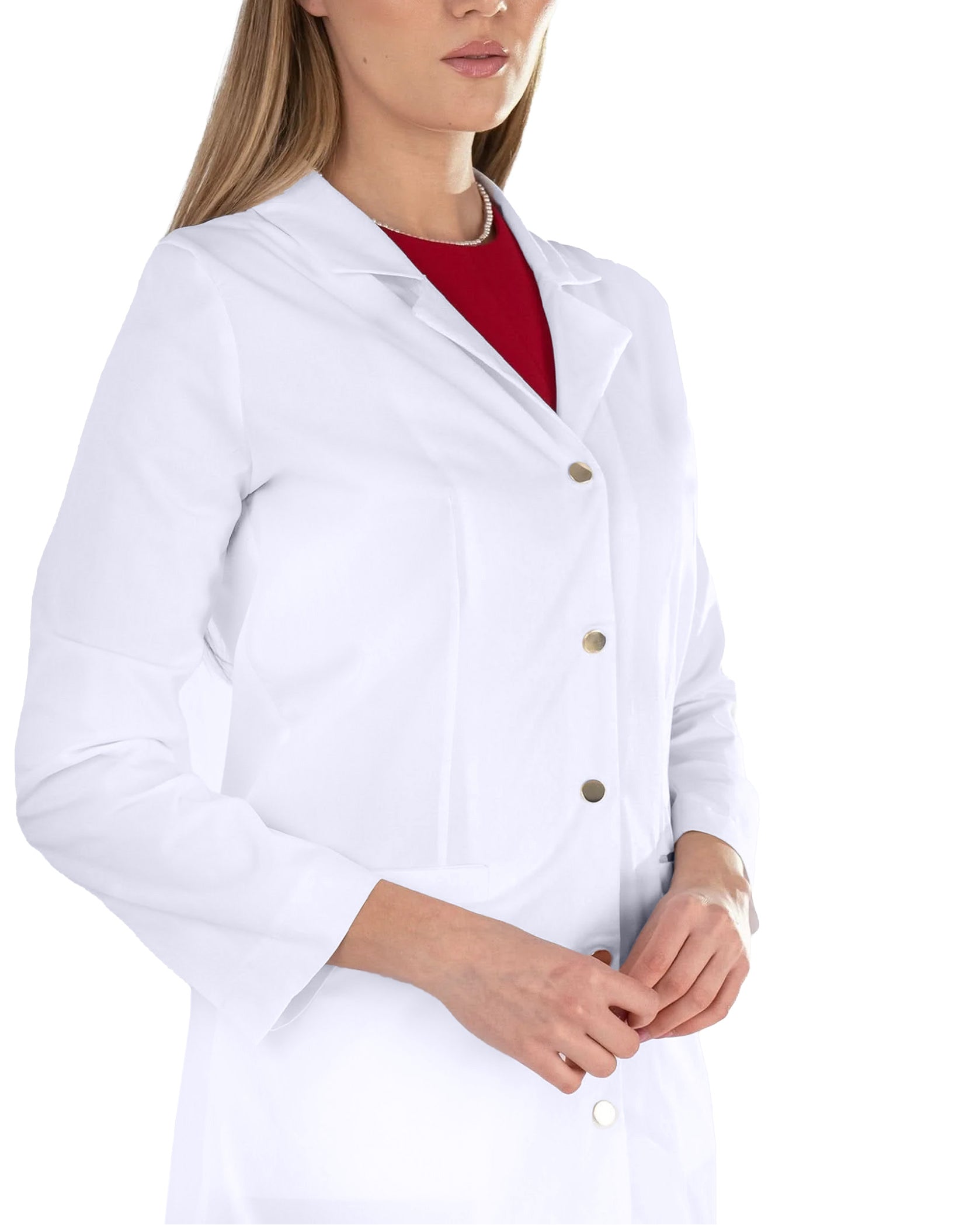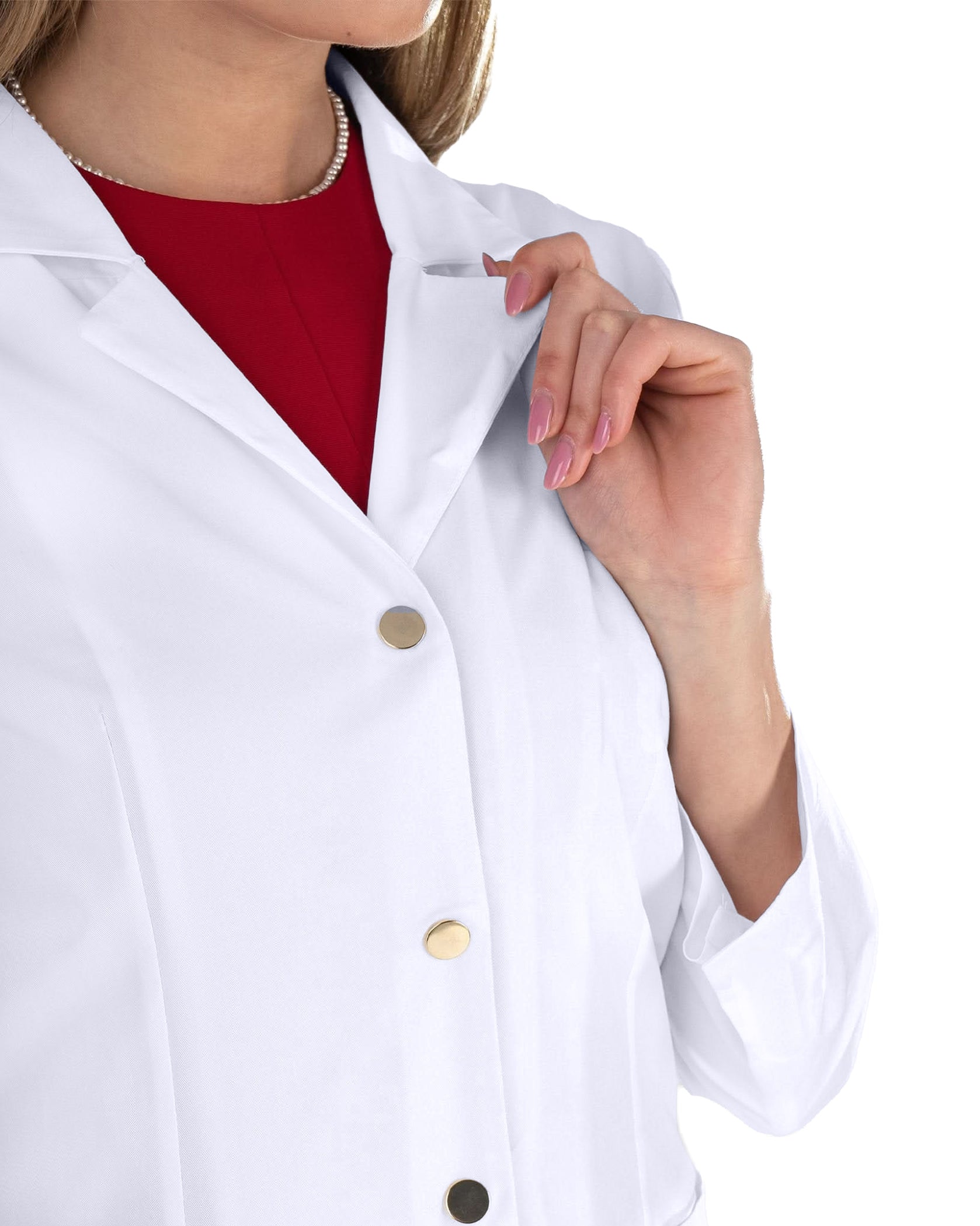 Croiala feminina si capsele aurii transforma halatul dintr-o simpla uniforma intr-o declaratie de profesionalism si prestanta.