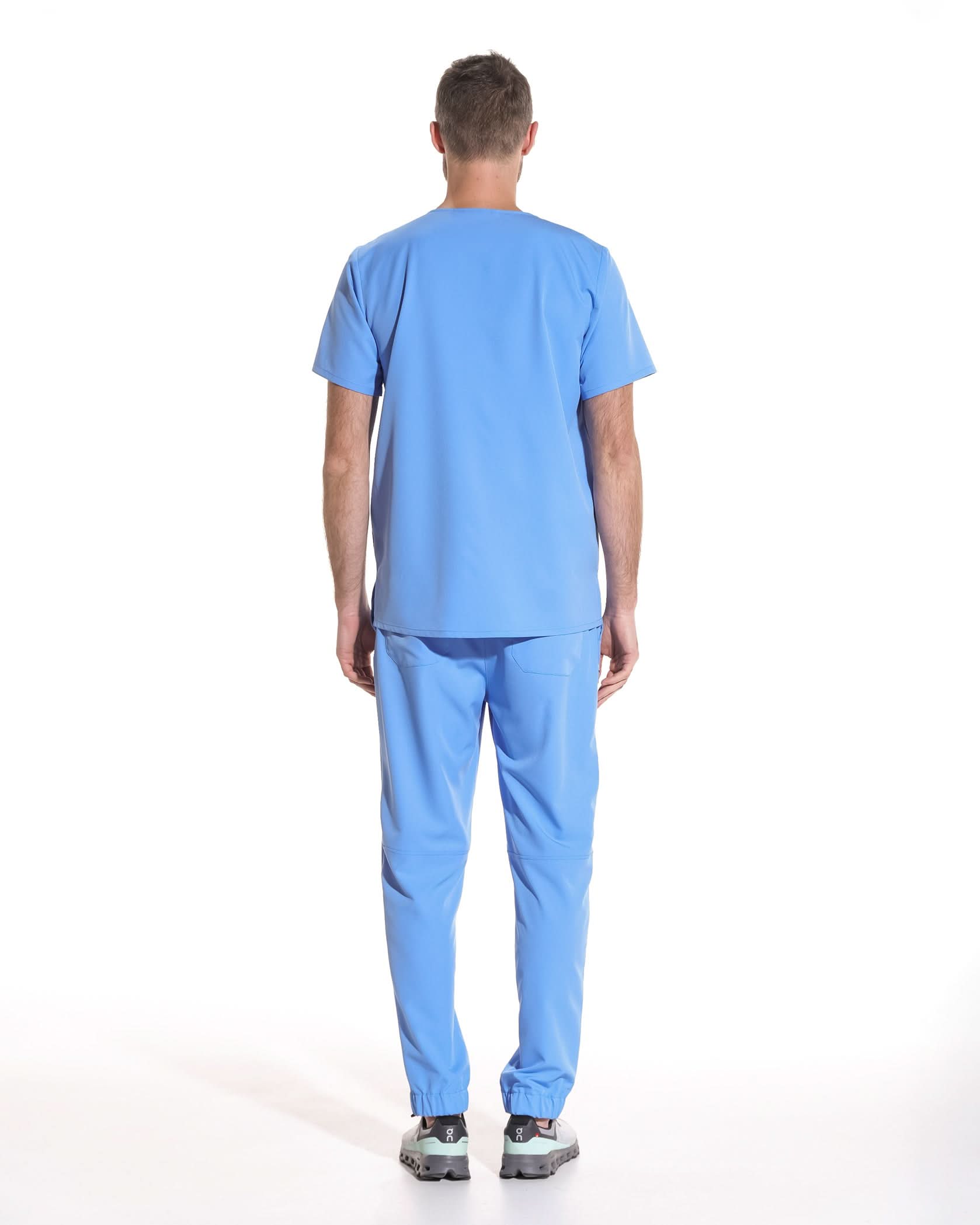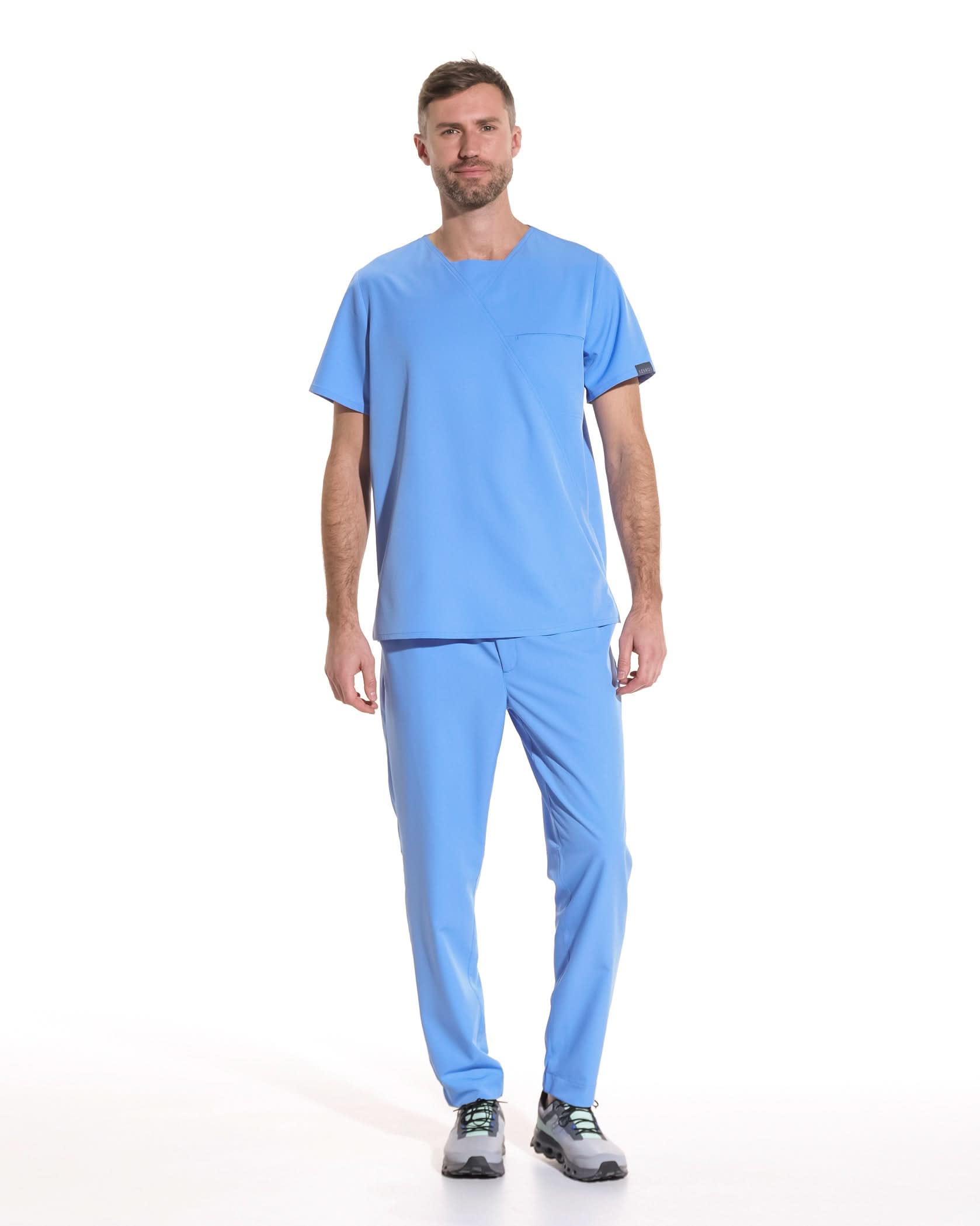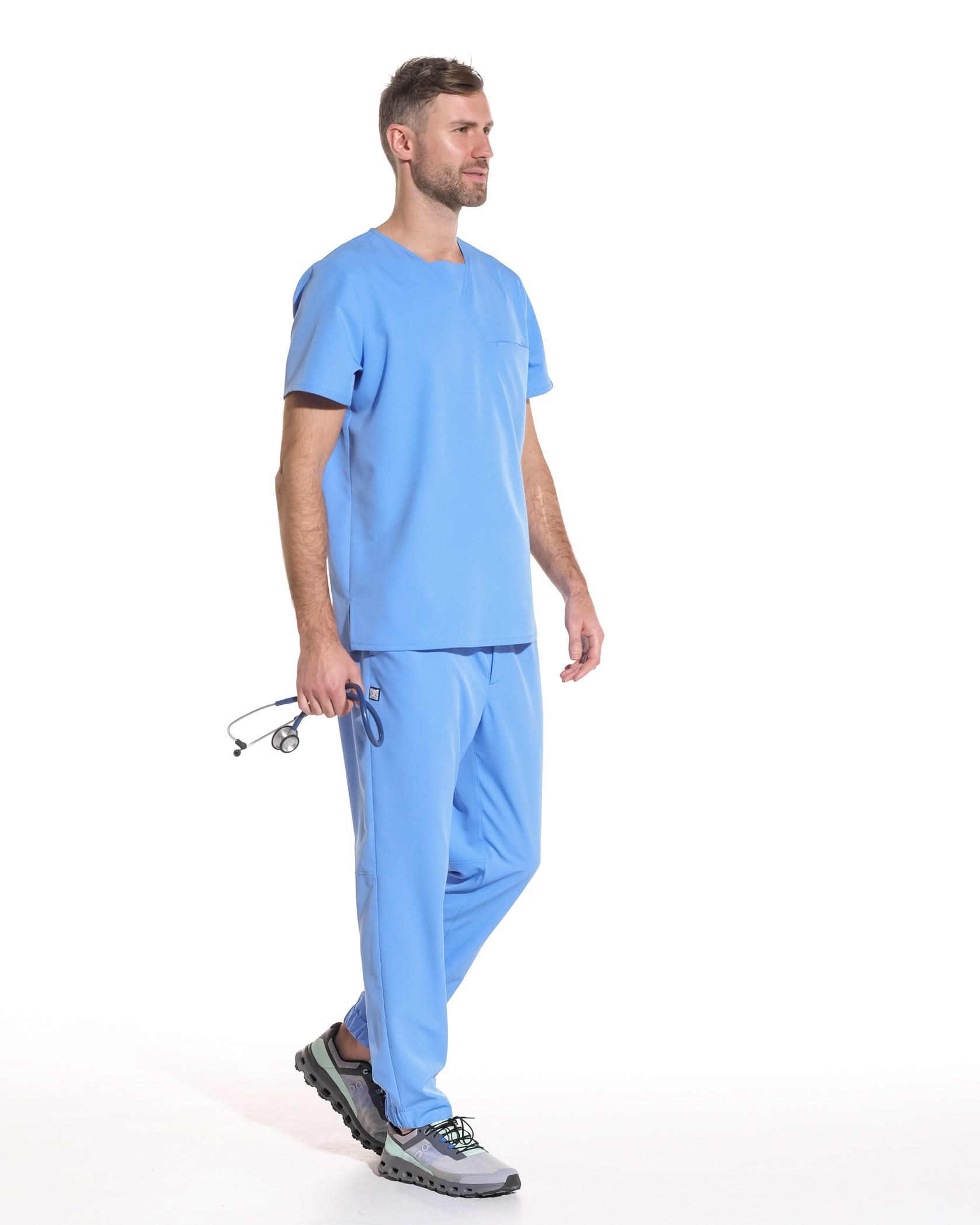 Pantaloni medicali RIZZ turcoaz cu talie elastica si snur reglabil in contrast. Materialul din care sunt confectionati pantalonii este moale, avand atat elasticitate, cat si rezistenta la sifonare.