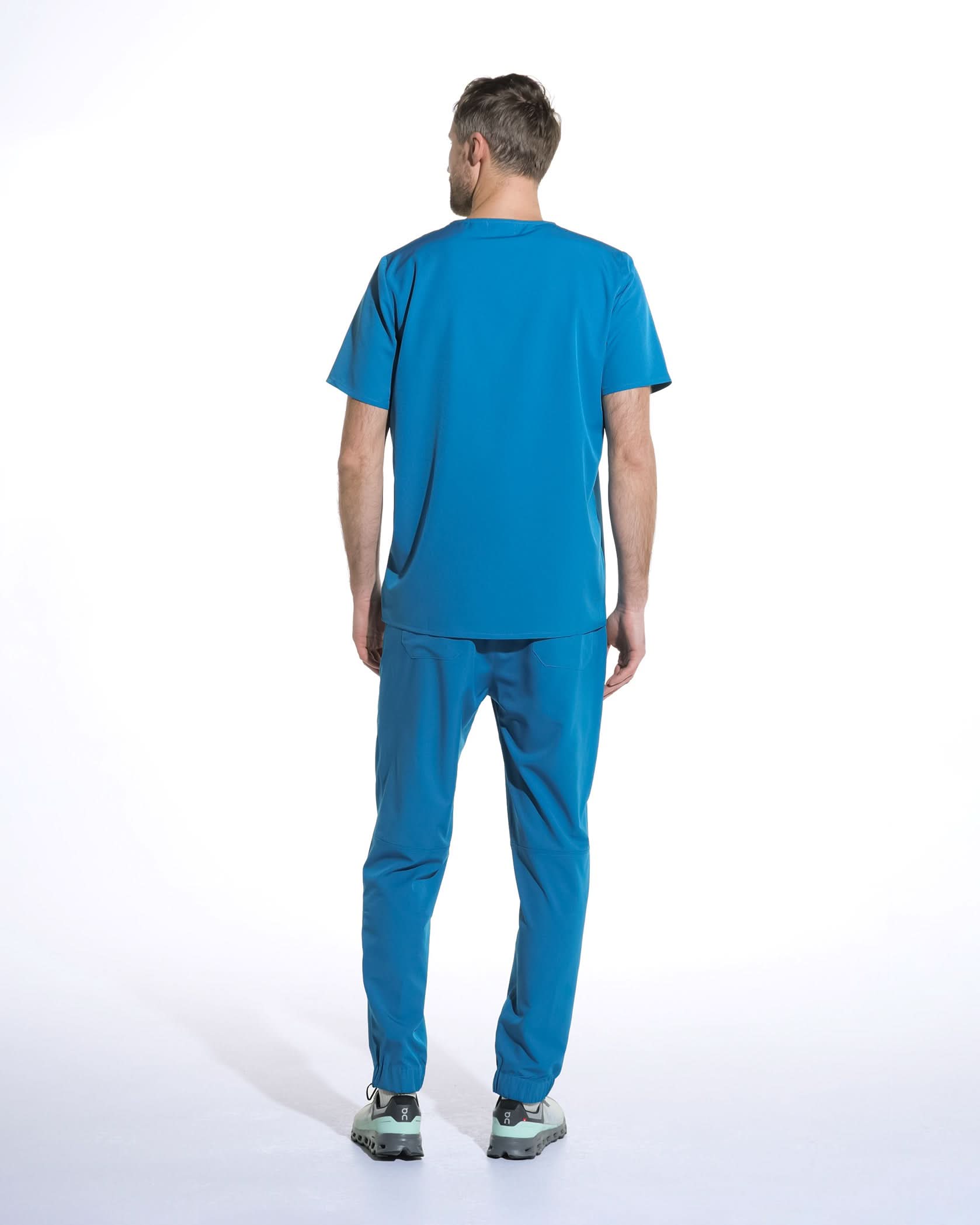 Pantaloni medicali RIZZ turcoaz cu talie elastica si snur reglabil in contrast. Materialul din care sunt confectionati pantalonii este moale, avand atat elasticitate, cat si rezistenta la sifonare.