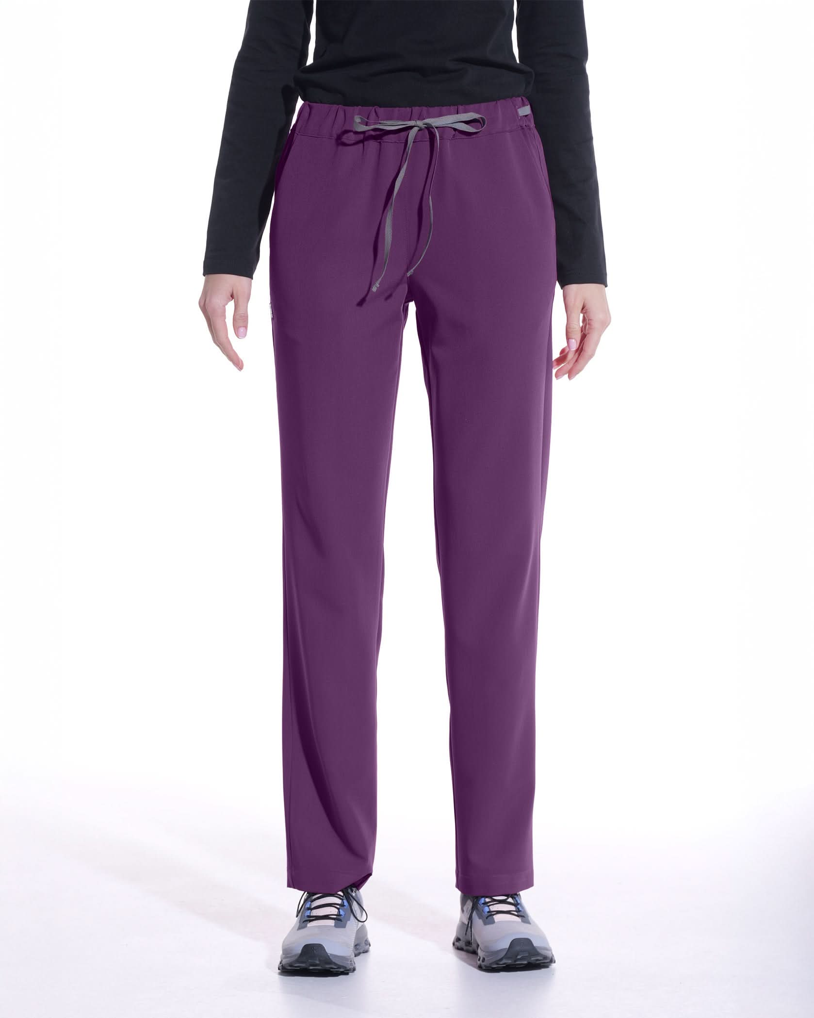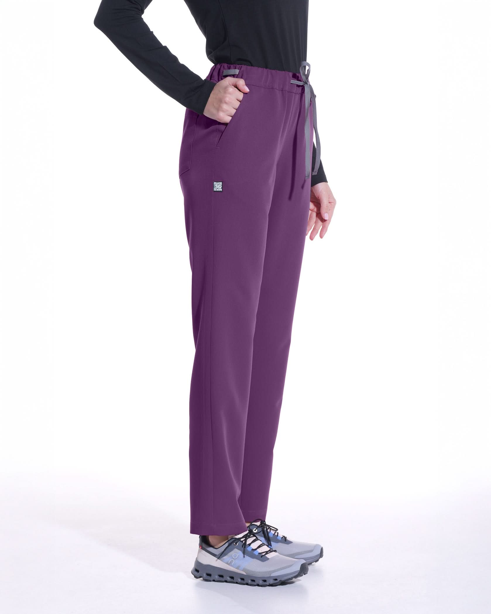 Pantaloni medicali drepti LINEA plum cu talie elastica si snur in contrast. Patru buzunare: doua pe spate si doua laterale.